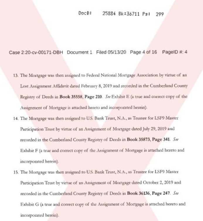 Here is yet another tale in the fraudulent scheme being perpetrated by “U.S. Bank Trust, N.A. as Trustee for the LSF9 Master Participation Trust.” I came upon this federal foreclosure action in the State of Maine captioned U.S. Bank Trust, N.A. as Trustee for the LSF9 Master Participation Trust v. Lee A. Plummer, USDC Maine Case No. 2:20-cv-00171-DBH. My latest check of the docket, in this case, shows that Defendant has yet to be located and served, and it appears the Plaintiff is getting ready to take a default soon. Even without a Defendant, however, the court should easily see that this complaint is a sham if it simply takes the time to read Plaintiff’s pleading. Take a look at ¶13 in the snippet below taken from the complaint’s statement of facts, “The Mortgage was then assigned to Federal National Mortgage Association by virtue of a Lost Assignment Affidavit dated February 8, 201[9.’]: